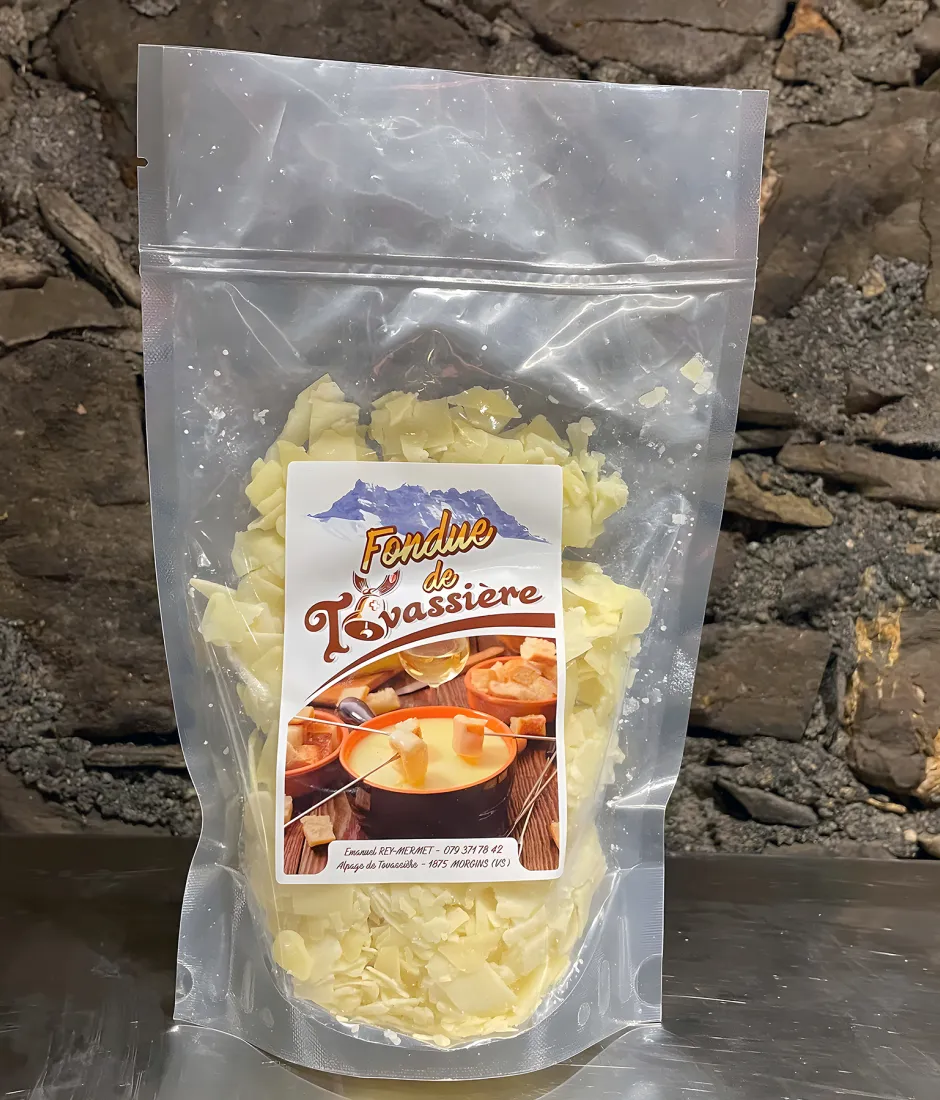 Sachet de fondue pour 2 personnes. Moitié notre fromage à raclette AOP au lait cru et moitié Gruyère AOP.